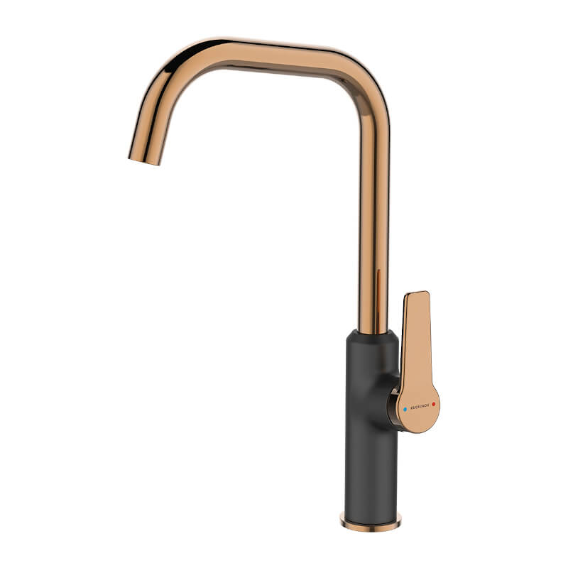 Stojąca bateria zlewozmywakowa ALANIS została zaprojektowana z dbałością o najmniejsze detale. Ma to wpływ nie tylko na jej funkcjonalność, ale też na stylowy wygląd. Połączenie matowego, czarnego koloru z barwą różowego złota prezentuje się niezwykle oryginalnie. Utrzymane są w niej wylewka, ergonomiczny uchwyt oraz rozeta.