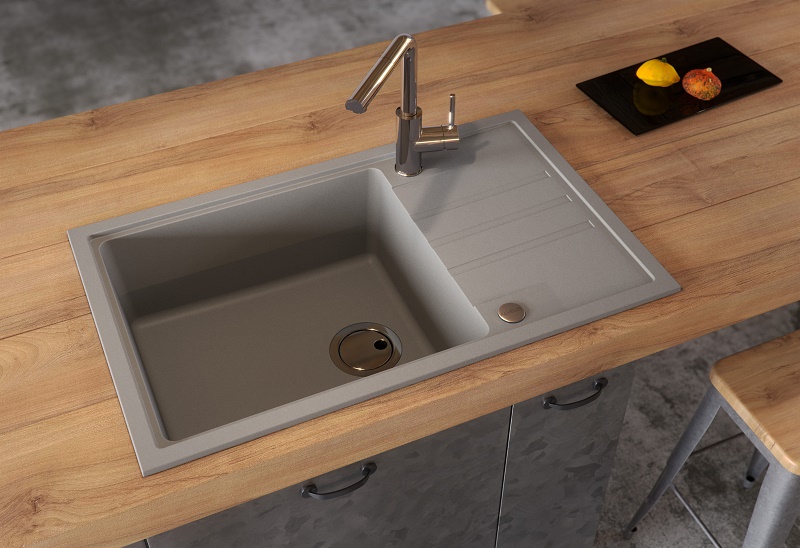 Załączone zdjęcie aranżacyjne przestawiają zlewozmywak Intermezzo 130 w kolorze 81 beton.