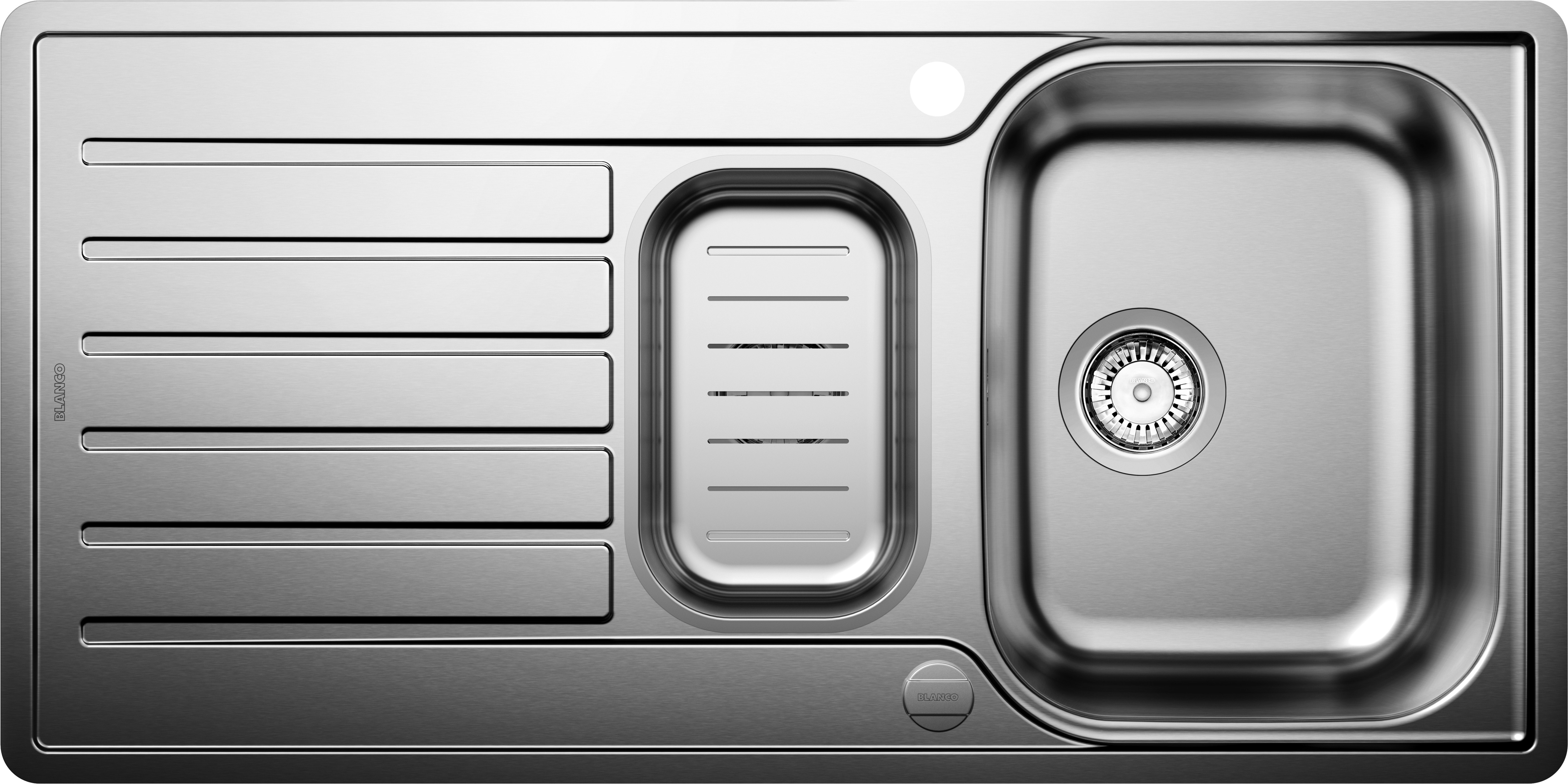 perforowana odsączarka ze stali szlachetnej, armatura przelewowo-odpływowa zapewniająca więcej miejsca w szafce, 2 x korek z sitkiem 3 ½'' ze sterowaniem korkiem automatycznym (pokrętło) do komory głównej