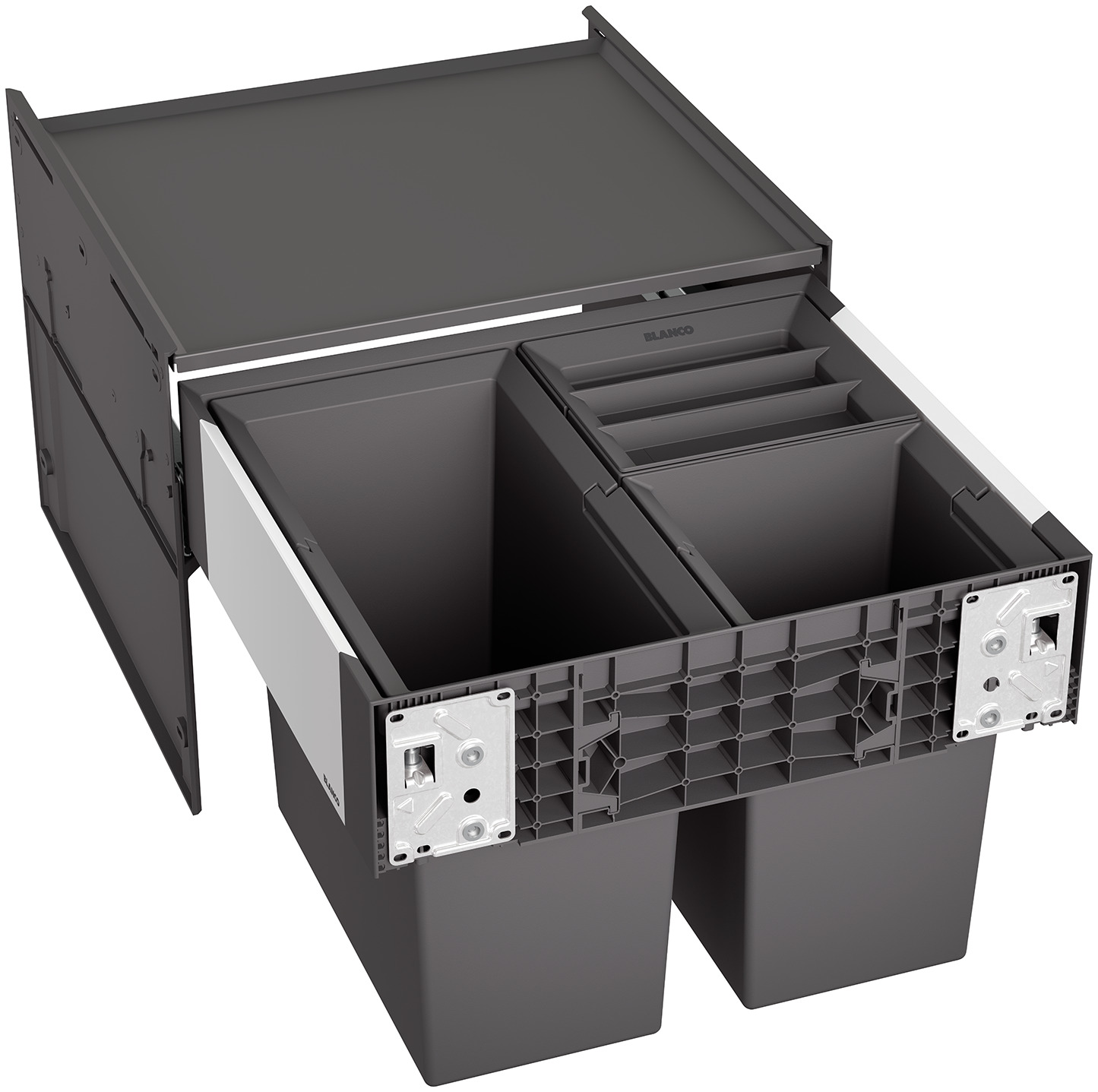 Nie ma potrzeby optycznego ukrywania systemów segregacji odpadów. Ciemne tworzywo sztuczne w połączeniu z aluminiowymi elementami zapewnia stylowy, nowoczesny wygląd.