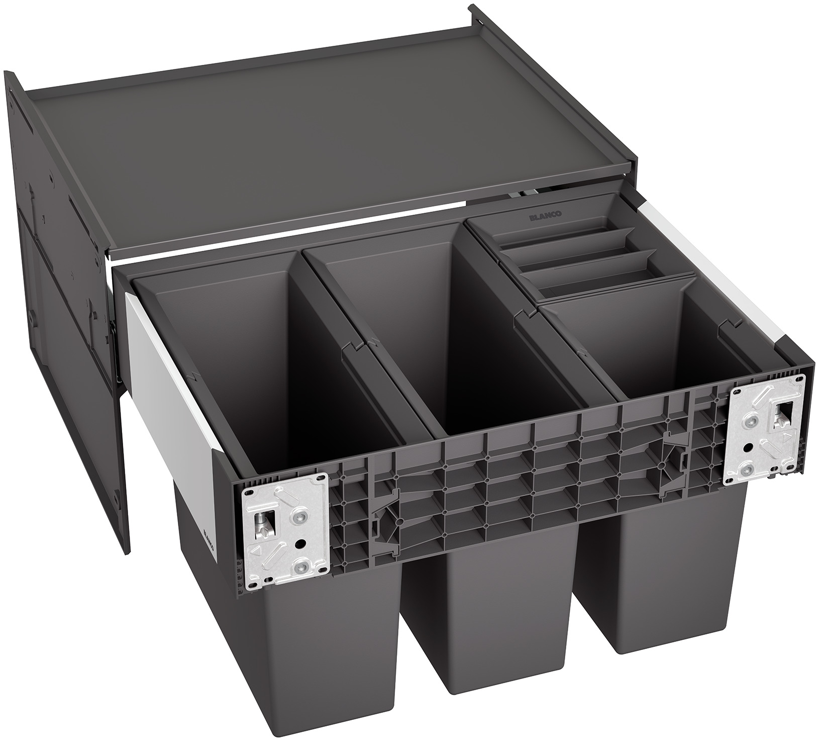 Nie ma potrzeby optycznego ukrywania systemów segregacji odpadów. Ciemne tworzywo sztuczne w połączeniu z aluminiowymi elementami zapewnia stylowy, nowoczesny wygląd.