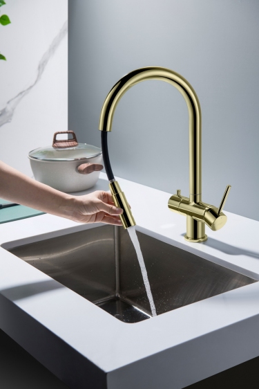 BATERIA Z PODŁĄCZENIEM DO WODY FILTROWANEJBATERIA Z WYCIĄGANĄ WYLEWKĄ - ABSOLUTNA NOWOŚĆ!Zintegrowany magnes umożliwiający szybkie chowania końcówki wylewki– wykończenie: kolor ZŁOTY– wylewka obrotowa do 360°– głowice ceramiczne– 2 elastyczne wężyki podłączeniowe 3/8“ – 600 mm– podłączenie do filtra z szybkozłączką– rączka mieszacza odchyla się do przodu, dzięki czemu można montować baterię pomiędzy zlewozmywakiem podwieszanym a ścianą.BATERIA Z DWOMA NIEZALEŻNYMI OBWODAMI:– mieszacz wody ciepłej i zimnej (prawa strona)– podłączenie do wody filtrowanej (lewa strona)