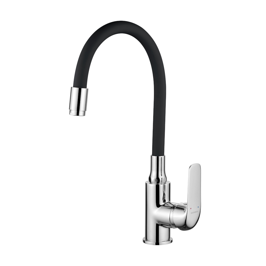 Stojąca bateria zlewozmywakowa ELZA z elastyczną wylewką jest ergonomiczna, poręczna, ale również stylowa. Klasyczne i eleganckie wykończenie typu chrom w połączeniu z gumową wylewką w czarnym kolorze prezentuje się bardzo oryginalnie. Z kolei obłe kształty całej konstrukcji dodają jej subtelności oraz nowoczesności. Ta charakterystyczna i gustowna bateria odmieni wygląd każdego zlewozmywaka.
