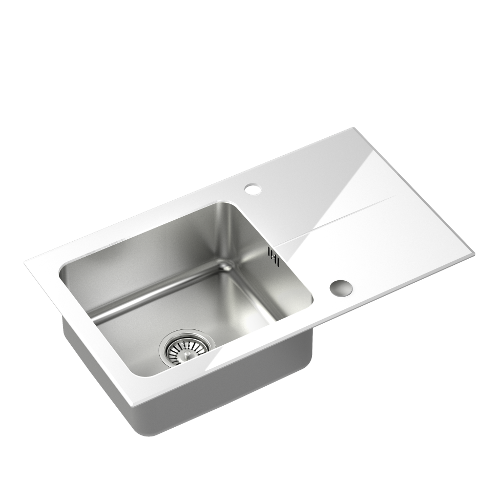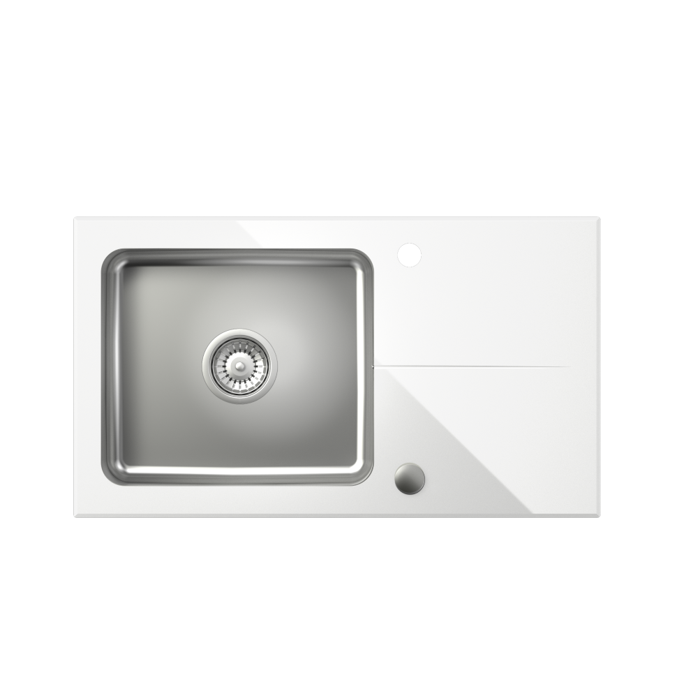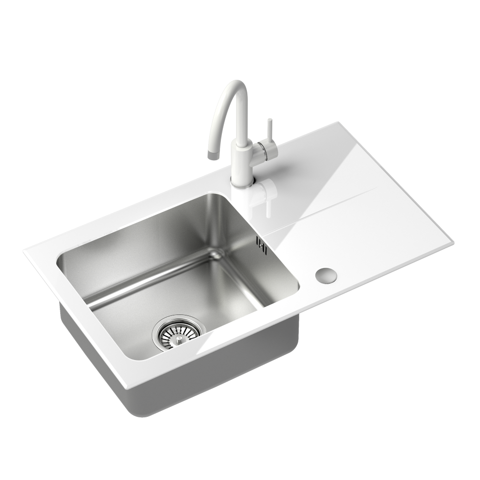 Strona główna » KUCHNIA » Hugh 111 komora stalowa z białym blatem szklanym z syfonem i zaślepką (770x440/R35) + NAOMI SteelQ stalowa bateria kuchenna biały połysk