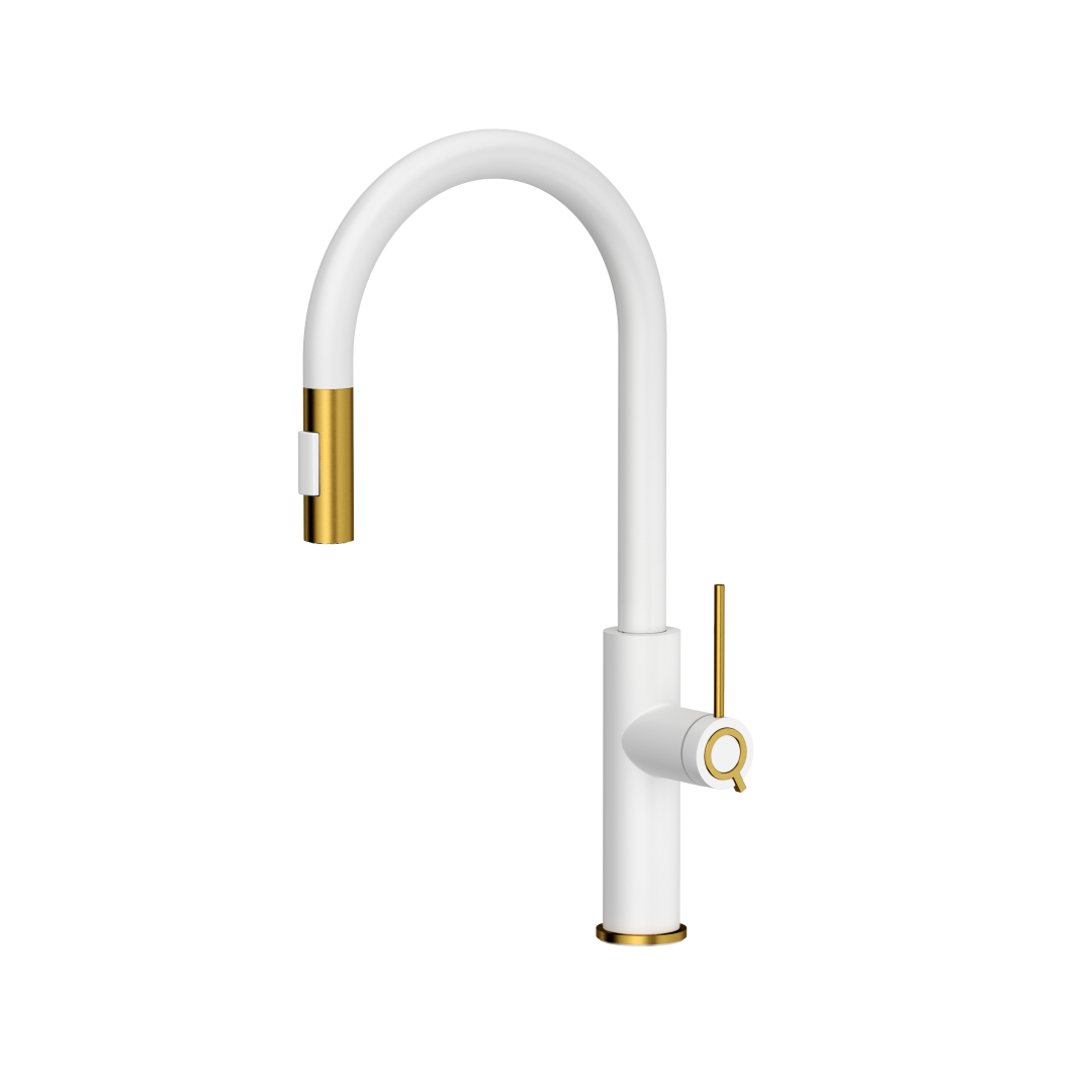 JENNIFER Q Line SLIM SteelQ snow white/Nano PVD złoty Bateria kuchenna Jennifer łączy w sobie nowoczesną estetykę i funkcjonalność. Wyciągana wylewka z funkcją prysznica to bardzo funkcjonalne rozwiązanie, które sprosta potrzebom najbardziej wymagających użytkowników. Wykonana ze stali szlachetnej, która jest bezpieczna i higieniczna - wolna od szkodliwego ołowiu i niklu. - Elementy baterii wykonane ze stali szlachetnej – wysoka trwałość i zerową zawartość ołowiu. - Dźwignia jednouchwytowa – łatwa i szybka zmiana temperatury i natężenia strumienia wody. - Dwustopniowa głowica ceramiczna wysokiej jakości – wygodne i bezproblemowe użytkowanie przez długie lata. - Mocowanie QFix – łatwy i szybki montaż (również na blacie) oraz wysoką stabilność baterii. - Wyciągana wylewka – wyjątkowy komfort użytkowania. - Przełączanie strumienia wody na prysznicowy – pozwala szybko opłukać warzywa, owoce lub naczynia przed włożeniem do zmywarki. Po użyciu prysznica i zamknięciu dopływu wody wylewka automatycznie powraca do napowietrzonego strumienia zapewniającego oszczędzanie wody. - Wężyki przyłączeniowe 60 cm