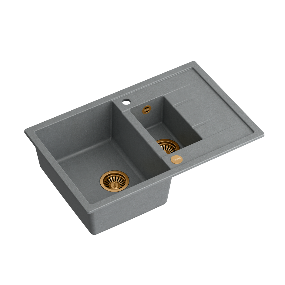 MORGAN 156 GraniteQ silver stone/elementy miedziane Zlewozmywak wykonany z GraniteQ gwarantuje najwyższą higieniczność i trwałość . Nowoczesne wzornictwo – dostosowane do aktualnych trendów. GraniteQ – zapewnia dużą twardość, trwałość i higieniczność powierzchni Zlewozmywak odwracalny – komora może być zamontowana po prawej lub lewej stronie. Rozetka przelewu również wykonana jest ze stali szlachetnej SteelQ w technologii PVD w kolorze dopasowanym do koloru pozostałych elementów co jeszcze bardziej podkreśla jego urodę. Zlewozmywak wyposażony jest w odpływ ze stali szlachetnej SteelQ w technologii PVD w kolorze dopasowanym do pozostałych elementów co nadaje produktowi elegancki wygląd oraz w syfon z możliwością podłączenia zmywarki lub pralki Głębokie i pojemne komory zlewozmywaków Quadron to ich cecha wyróżniająca, która zapewnia duży komfort użytkowania. Łatwy montaż - w komplecie zaczepy mocujące Wersja Premium Głębokie komory zlewozmywaków Quadron to ich cecha wyróżniająca. Pojemna komora to przede wszystkim duży komfort użytkowania. Zmywanie dużych garnków czy blach nie stanowi problemu dzięki temu, że pojemność zlewozmywaka jest zwiększona o kilka litrów. Zlewozmywak wyposażony jest w odpływ ze stali szlachetnej SteelQ w technologii PVD w wybranym kolorze co nadaje mu elegancki wygląd. GraniteQ - wygląd & trwałość Produkty wykonane z GraniteQ zapewniają nowoczesny wygląd i długowieczność produktu. Są łatwe do utrzymania w czystości, odporne na wysokie temperatury (gorące garnki) oraz tak częste w kuchni nagłe jej zmiany (wrząca i zimna woda), odporne na działanie czynników chemicznych oraz wiele rodzajów osadów (np. po kawie czy herbacie). GraniteQ – wytrzymałość & higiena Materiał GraniteQ stworzony jest z drobnych cząsteczek granitu (75-80%) połączonych ze sobą za pomocą wysokiej jakości spoiwa (20-25%), dzięki czemu zlewozmywak charakteryzuje się wyjątkową wytrzymałością i odpornością. Zastosowanie bardzo drobnych cząsteczek granitu minimalizuje przestrzeń wypełnioną spoiwem, dzięki czemu udało się uzyskać zlewozmywak jedwabiście gładki i delikatny w dotyku, co również ma ogromne znaczenie podczas czyszczenia i konserwacji, ale przede wszystkim dla higieny i zachowania czystości. GraniteQ – metaliczny blask GraniteQ to nowoczesny materiał w opalizujących kolorach uzyskanych dzięki domieszce metalicznych drobinek. Nawet najbardziej wymagający użytkownicy będą usatysfakcjonowani gdy światło z oświetlenia umieszczonego nad blatem sprawi, iż kuchnia zabłyszczy delikatnym połyskiem swojej nowej biżuterii: zlewozmywaka marki Quadron. Efekt ten zostanie spotęgowany dzięki dodaniu baterii, odpływu i przelewu wykonanych ze stali szlachetnej SteelQ w technologii PVD w kolorach złota lub miedzi.
