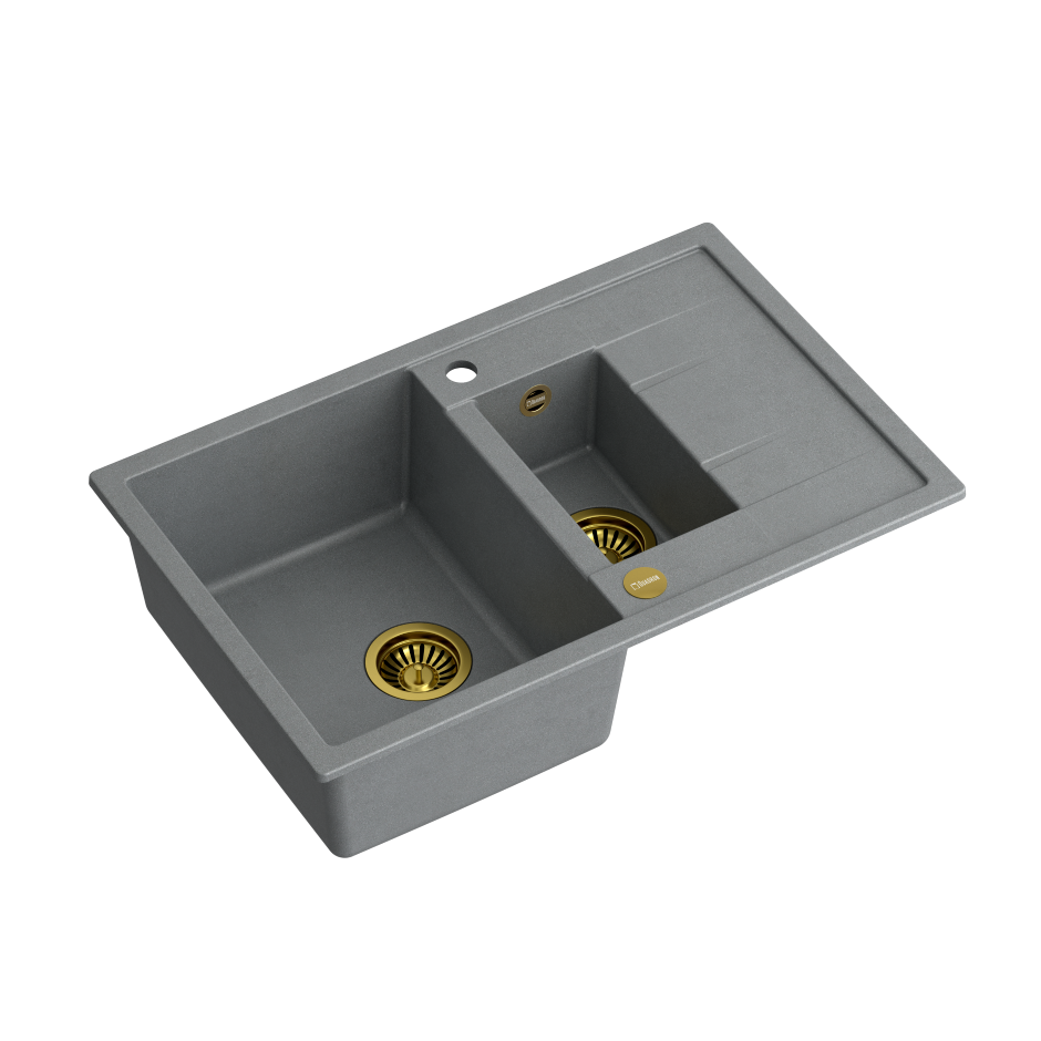MORGAN 156 GraniteQ silver stone/elementy złote Zlewozmywak wykonany z GraniteQ gwarantuje najwyższą higieniczność i trwałość . Nowoczesne wzornictwo – dostosowane do aktualnych trendów. GraniteQ – zapewnia dużą twardość, trwałość i higieniczność powierzchni Zlewozmywak odwracalny – komora może być zamontowana po prawej lub lewej stronie. Rozetka przelewu również wykonana jest ze stali szlachetnej SteelQ w technologii PVD w kolorze dopasowanym do koloru pozostałych elementów co jeszcze bardziej podkreśla jego urodę. Zlewozmywak wyposażony jest w odpływ ze stali szlachetnej SteelQ w technologii PVD w kolorze dopasowanym do pozostałych elementów co nadaje produktowi elegancki wygląd oraz w syfon z możliwością podłączenia zmywarki lub pralki Głębokie i pojemne komory zlewozmywaków Quadron to ich cecha wyróżniająca, która zapewnia duży komfort użytkowania. Łatwy montaż - w komplecie zaczepy mocujące Wersja Premium Głębokie komory zlewozmywaków Quadron to ich cecha wyróżniająca. Pojemna komora to przede wszystkim duży komfort użytkowania. Zmywanie dużych garnków czy blach nie stanowi problemu dzięki temu, że pojemność zlewozmywaka jest zwiększona o kilka litrów. Zlewozmywak wyposażony jest w odpływ ze stali szlachetnej SteelQ w technologii PVD w wybranym kolorze co nadaje mu elegancki wygląd. GraniteQ - wygląd & trwałość Produkty wykonane z GraniteQ zapewniają nowoczesny wygląd i długowieczność produktu. Są łatwe do utrzymania w czystości, odporne na wysokie temperatury (gorące garnki) oraz tak częste w kuchni nagłe jej zmiany (wrząca i zimna woda), odporne na działanie czynników chemicznych oraz wiele rodzajów osadów (np. po kawie czy herbacie). GraniteQ – wytrzymałość & higiena Materiał GraniteQ stworzony jest z drobnych cząsteczek granitu (75-80%) połączonych ze sobą za pomocą wysokiej jakości spoiwa (20-25%), dzięki czemu zlewozmywak charakteryzuje się wyjątkową wytrzymałością i odpornością. Zastosowanie bardzo drobnych cząsteczek granitu minimalizuje przestrzeń wypełnioną spoiwem, dzięki czemu udało się uzyskać zlewozmywak jedwabiście gładki i delikatny w dotyku, co również ma ogromne znaczenie podczas czyszczenia i konserwacji, ale przede wszystkim dla higieny i zachowania czystości. GraniteQ – metaliczny blask GraniteQ to nowoczesny materiał w opalizujących kolorach uzyskanych dzięki domieszce metalicznych drobinek. Nawet najbardziej wymagający użytkownicy będą usatysfakcjonowani gdy światło z oświetlenia umieszczonego nad blatem sprawi, iż kuchnia zabłyszczy delikatnym połyskiem swojej nowej biżuterii: zlewozmywaka marki Quadron. Efekt ten zostanie spotęgowany dzięki dodaniu baterii, odpływu i przelewu wykonanych ze stali szlachetnej SteelQ w technologii PVD w kolorach złota lub miedzi.