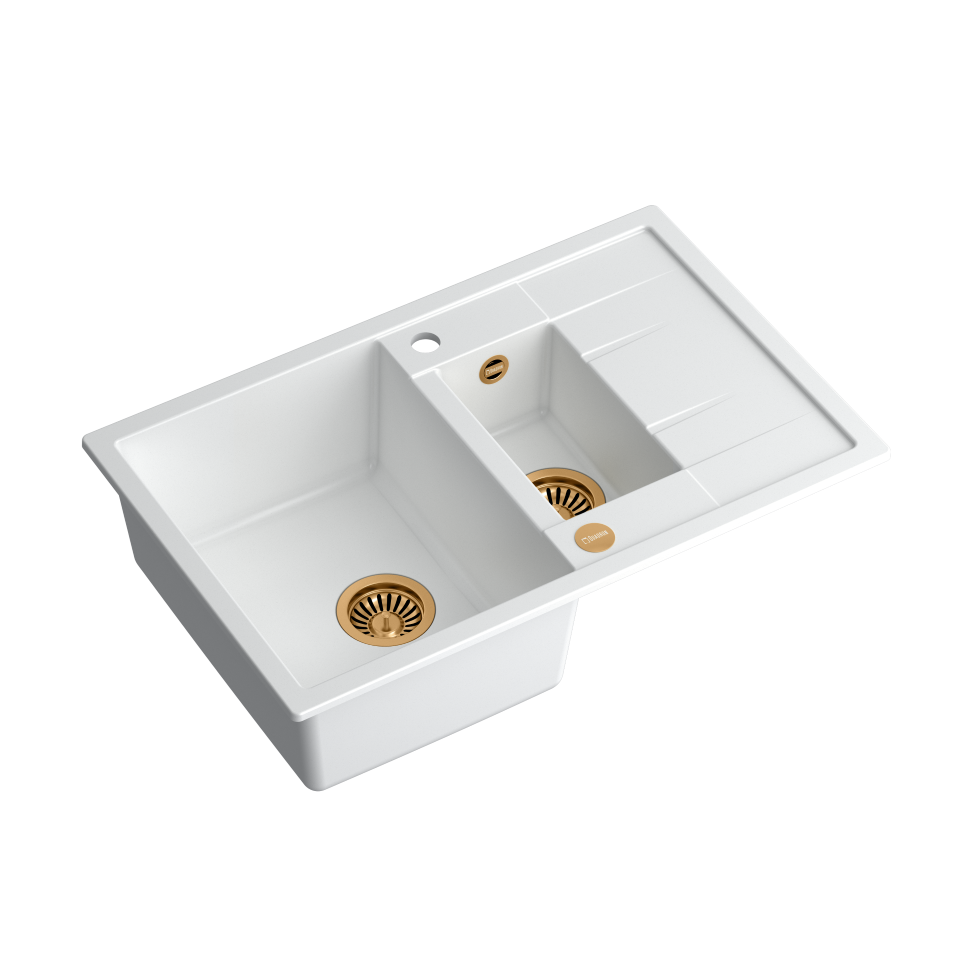 MORGAN 156 GraniteQ snow white/elementy miedziane Zlewozmywak wykonany z GraniteQ gwarantuje najwyższą higieniczność i trwałość . Nowoczesne wzornictwo – dostosowane do aktualnych trendów. GraniteQ – zapewnia dużą twardość, trwałość i higieniczność powierzchni Zlewozmywak odwracalny – komora może być zamontowana po prawej lub lewej stronie. Rozetka przelewu również wykonana jest ze stali szlachetnej SteelQ w technologii PVD w kolorze dopasowanym do koloru pozostałych elementów co jeszcze bardziej podkreśla jego urodę. Zlewozmywak wyposażony jest w odpływ ze stali szlachetnej SteelQ w technologii PVD w kolorze dopasowanym do pozostałych elementów co nadaje produktowi elegancki wygląd oraz w syfon z możliwością podłączenia zmywarki lub pralki Głębokie i pojemne komory zlewozmywaków Quadron to ich cecha wyróżniająca, która zapewnia duży komfort użytkowania. Łatwy montaż - w komplecie zaczepy mocujące Wersja Premium Głębokie komory zlewozmywaków Quadron to ich cecha wyróżniająca. Pojemna komora to przede wszystkim duży komfort użytkowania. Zmywanie dużych garnków czy blach nie stanowi problemu dzięki temu, że pojemność zlewozmywaka jest zwiększona o kilka litrów. Zlewozmywak wyposażony jest w odpływ ze stali szlachetnej SteelQ w technologii PVD w wybranym kolorze co nadaje mu elegancki wygląd. GraniteQ - wygląd & trwałość Produkty wykonane z GraniteQ zapewniają nowoczesny wygląd i długowieczność produktu. Są łatwe do utrzymania w czystości, odporne na wysokie temperatury (gorące garnki) oraz tak częste w kuchni nagłe jej zmiany (wrząca i zimna woda), odporne na działanie czynników chemicznych oraz wiele rodzajów osadów (np. po kawie czy herbacie). GraniteQ – wytrzymałość & higiena Materiał GraniteQ stworzony jest z drobnych cząsteczek granitu (75-80%) połączonych ze sobą za pomocą wysokiej jakości spoiwa (20-25%), dzięki czemu zlewozmywak charakteryzuje się wyjątkową wytrzymałością i odpornością. Zastosowanie bardzo drobnych cząsteczek granitu minimalizuje przestrzeń wypełnioną spoiwem, dzięki czemu udało się uzyskać zlewozmywak jedwabiście gładki i delikatny w dotyku, co również ma ogromne znaczenie podczas czyszczenia i konserwacji, ale przede wszystkim dla higieny i zachowania czystości. GraniteQ – metaliczny blask GraniteQ to nowoczesny materiał w opalizujących kolorach uzyskanych dzięki domieszce metalicznych drobinek. Nawet najbardziej wymagający użytkownicy będą usatysfakcjonowani gdy światło z oświetlenia umieszczonego nad blatem sprawi, iż kuchnia zabłyszczy delikatnym połyskiem swojej nowej biżuterii: zlewozmywaka marki Quadron. Efekt ten zostanie spotęgowany dzięki dodaniu baterii, odpływu i przelewu wykonanych ze stali szlachetnej SteelQ w technologii PVD w kolorach złota lub miedzi.