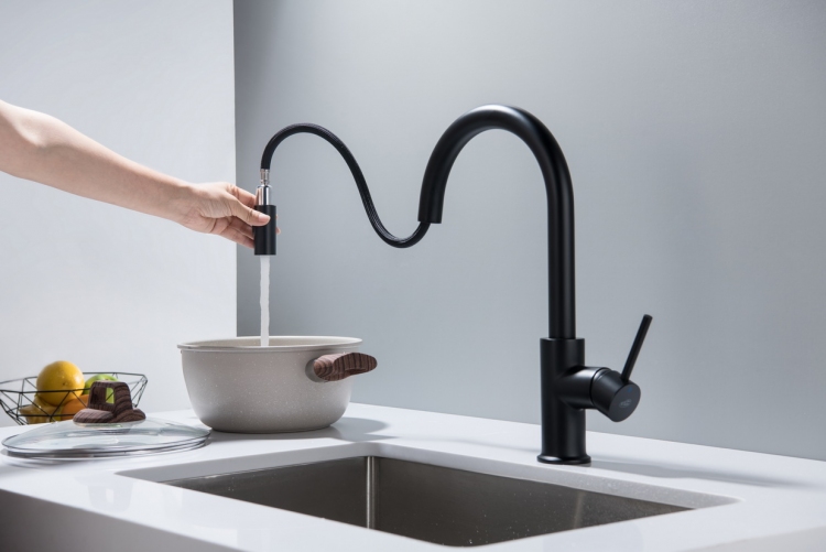 BATERIA Z WYCIĄGANĄ WYLEWKĄ Z PRZEŁĄCZNIKIEM STRUMIENIA WODY!Zintegrowany magnes umożliwiający szybkie chowania końcówki wylewki– wykończenie: CZARNY MAT– materiał: mosiądz– rączka mieszacza odchyla się do przodu, dzięki czemu można montować baterię pomiędzy zlewozmywakiem podwieszanym a ścianą.– głowica ceramiczna– wylewka obrotowa 360°– elastyczne wężyki podłączeniowe 3/8“ – min. 450 mm