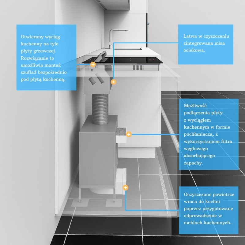 Opis:Klasa energetyczna: B, płyta szklana ceramiczna, szer. 59 cm, gł. 52 cm, sterowanie dotykowe Touch Control, wydajność max. 545 m3/h, głośność min. 37 dB, wykonanie: ceramika, stal szlachetna (nierdzewna) Inox.Cechą charakterystyczną i główną zaletą płyty indukcyjnej z okapem blatowym GLOBALO Oranier KXI 1062 Basic-Plus jest ulokowanie wyciągu kuchennego na tyle płyty grzewczej. Rozwiązanie to umożliwia komfortowe gotowania na pełnej szerokości płyty. Dodatkowo rozwiązanie to sprawia, że istnieje możliwość zamontowania szuflad bezpośrednio pod płytą kuchenną.Okap charakteryzuje się cichą pracą nawet na najwyższym biegu, dzięki czemu w trakcie jego pracy możesz swobodnie rozmawiać lub słuchać muzyki. Klapa okapu po zamknięciu licuje się na równi z płytą grzewczą, dzięki czemu całość jest prosta w czyszczeniu, podobnie jak zintegrowana miska ociekowa i filtr przeciwtłuszczowy - wystarczy, że włożysz je do zmywarki. Linia OranierZalety i korzyści dla użytkownika płyty indukcyjnej z okapem blatowym GLOBALO Oranier KXI 1062 Basic-PlusPołączenie okapu kuchennego ze szklaną płytą grzewczą usatysfakcjonuje zarówno wielbicieli futurystycznego designu, jak i tych, którzy ponad wszystko stawiają na funkcjonalność. Wydajność maksymalna: 545 m3/h Praca w trybie pochłaniacza/wyciągu Sterowanie dotykowe (zintegrowane z płytą indukcyjną)Funkcjonalności: Okap kuchenny działa zarówno w trybie pochłaniacza absorbując zapachy dzięki filtrowi węglowemu jak i wyciągu. Funkcje związane z działaniem płyty grzewczej, takie jak opóźnione wyłączenie, funkcja grilla, ułatwiają przygotowywanie posiłków i zapanowanie nad kuchennym chaosem. Intuicyjne sterowanie dotykowe. Timer wyłączy okap po ustalonym przez użytkownika czasie. Funkcja blokady przed dziećmi, daje rodzicom poczucie bezpieczeństwa i pewność, że ich pociechy same nie włączą płyty grzewczej. Wskaźnik czyszczenia filtra przeciwtłuszczowego (wyłapującego cząsteczki tłuszczu) dostępny na wyświetlaczu. Dzięki temu wiadomo, kiedy go wyczyścić.Przeznaczenie: Okap kuchenny połączony z płytą grzewczą sprawdzi się w innowacyjnych, funkcjonalnych kuchniach. Dzięki możliwości rezygnacji z tradycyjnego okapu, zyskuje się wolną przestrzeń w zabudowie kuchennej.Materiały: Stal szlachetna (nierdzewna) jest elegancka i łatwo ją pielęgnować. Ceramika jest idealnie gładka, nie sprawia trudności w myciu i jest odporna na uszkodzenia.Dobrze wiedzieć!Ceramika jest materiałem łatwym do utrzymania w czystości. Wystarczy przetrzeć zabrudzenia miękką ściereczką, nasączoną jedynie odpowiednim (przeznaczonym do płyt grzewczych) preparatem.