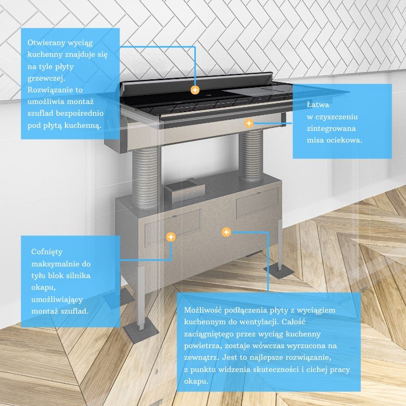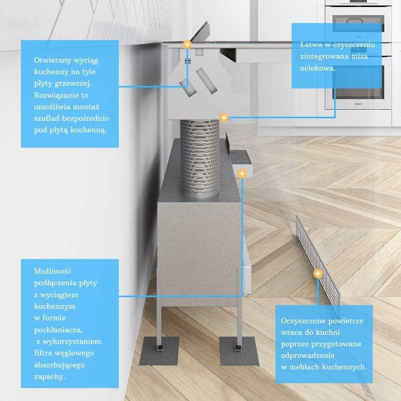 Opis:Klasa energetyczna: B, płyta szklana ceramiczna, szer. 91 cm, gł. 52 cm, sterowanie dotykowe Touch Control, wydajność max. 674 m3/h, głośność min. 45 dB, wykonanie: ceramika, stal szlachetna (nierdzewna) Inox.Cechą charakterystyczną i główną zaletą płyty indukcyjnej z okapem blatowym GLOBALO Oranier KXI 1092 Basic-Plus jest ulokowanie wyciągu kuchennego na tyle płyty grzewczej. Rozwiązanie to umożliwia komfortowe gotowania na pełnej szerokości płyty. Dodatkowo rozwiązanie to sprawia, że istnieje możliwość zamontowania szuflad bezpośrednio pod płytą kuchenną.Okap charakteryzuje się cichą pracą nawet na najwyższym biegu, dzięki czemu w trakcie jego pracy możesz swobodnie rozmawiać lub słuchać muzyki. Klapa okapu po zamknięciu licuje się na równi z płytą grzewczą, dzięki czemu całość jest prosta w czyszczeniu, podobnie jak zintegrowana miska ociekowa i filtr przeciwtłuszczowy - wystarczy, że włożysz je do zmywarki. Linia OranierZalety i korzyści dla użytkownika płyty indukcyjnej z okapem blatowym GLOBALO Oranier KXI 1092 Basic-PlusPołączenie okapu kuchennego ze szklaną płytą grzewczą usatysfakcjonuje zarówno wielbicieli futurystycznego designu, jak i tych, którzy ponad wszystko stawiają na funkcjonalność. Wydajność maksymalna: 674 m3/h Praca w trybie pochłaniacza Sterowanie dotykowe (zintegrowane z płytą indukcyjną)Funkcjonalności: Funkcje związane z działaniem płyty grzewczej, takie jak opóźnione wyłączenie, funkcja grilla ułatwiają przygotowywanie posiłków. Intuicyjne sterowanie dotykowe. Timer wyłączy okap po ustalonym przez użytkownika czasie. Funkcja blokady przed dziećmi, daje rodzicom poczucie bezpieczeństwa i pewność, że ich pociechy same nie włączą płyty grzewczej. Wskaźnik czyszczenia filtra przeciwtłuszczowego (wyłapującego cząsteczki tłuszczu) dostępny na wyświetlaczu. Dzięki temu wiadomo, kiedy go wyczyścić. 3 indukcyjne strefy gotowana Wskaźnik ciepła resztkowego Zabezpieczenie przed przegrzaniem Ręczne przełączanie mostu (sąsiednie pola grzejne po prawej stronie można połączyć ze strefą pieczenia)Przeznaczenie: Okap kuchenny połączony z płytą grzewczą sprawdzi się w innowacyjnych, funkcjonalnych kuchniach. Dzięki możliwości rezygnacji z tradycyjnego okapu, zyskuje się wolną przestrzeń w zabudowie kuchennej.Materiały: Stal szlachetna (nierdzewna) jest elegancka i łatwo ją pielęgnować. Ceramika jest idealnie gładka, nie sprawia trudności w myciu i jest odporna na uszkodzenia.Dobrze wiedzieć!Ceramika jest materiałem łatwym do utrzymania w czystości. Wystarczy przetrzeć zabrudzenia miękką ściereczką, nasączoną jedynie odpowiednim (przeznaczonym do płyt grzewczych) preparatem.
