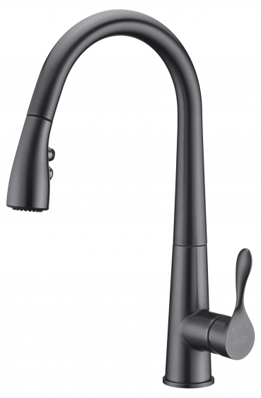 BATERIA Z WYCIĄGANĄ WYLEWKĄ Z PRZEŁĄCZNIKIEM STRUMIENIA WODY – wykończenie: GRAFIT (GUN METAL)– rączka mieszacza odchyla się do przodu, dzięki czemu można montować baterię pomiędzy zlewozmywakiem podwieszanym a ścianą.– wylewka obrotowa 360°– elastyczne wężyki podłączeniowe 3/8“ – 500 mm